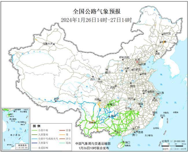 預計1月26日14時至27日14時,西藏南部、四川南部、貴州中北部、云南東北部等地部分道路受小到中雪或雨夾雪影響;重慶、云南、貴州南部、廣西、湖南中南部、江西中部等地部分道路受小到中雨影響;貴州西部等地部分道路受凍雨影響。另外,吉林中部、四川中東部、云南中部、新疆西北部等地局部道路受霧影響能見度低。