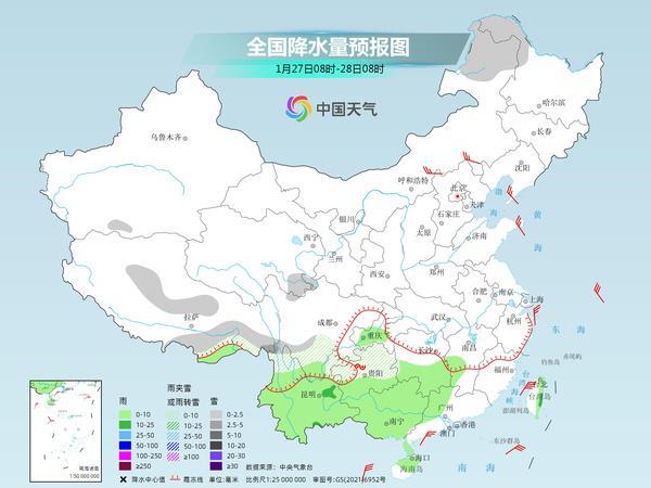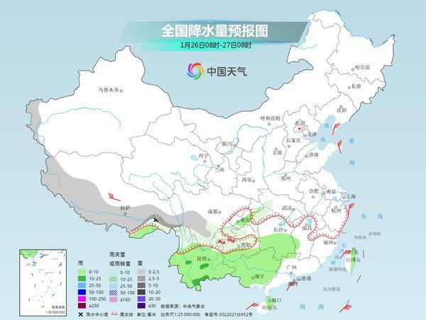 昨天,中東部大部雨雪稀少,降水主要出現(xiàn)在西南地區(qū)等地。監(jiān)測(cè)顯示,昨天8時(shí)至今天6時(shí),四川盆地、貴州西部等地部分地區(qū)出現(xiàn)降雨(雪)或雨夾雪;云南大部出現(xiàn)小到中雨,西雙版納局地大雨;貴州西部局地出現(xiàn)凍雨。