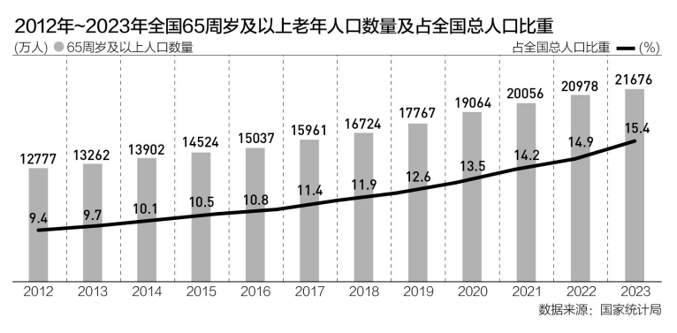 國家統(tǒng)計局發(fā)布最新人口數(shù)據(jù)顯示,60歲及以上人口29697萬人,占全國人口的21.1%,其中65歲及以上人口21676萬人,占全國人口的15.4%。根據(jù)聯(lián)合國關于老齡化的劃分標準,我國已經(jīng)進入了中度老齡社會。