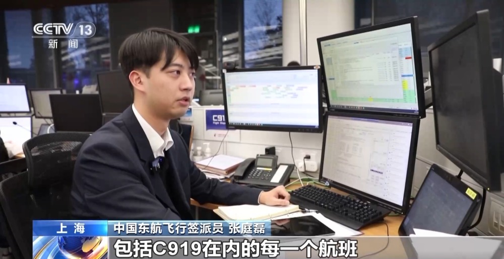 晚上10點(diǎn),C919國產(chǎn)大飛機(jī)值班簽派員張庭磊的工作臺上,多個(gè)顯示屏不斷更新信息,首次參與春運(yùn),和機(jī)組安全飛行息息相關(guān)的氣象、燃油、線路等核心數(shù)據(jù),正在加速度“跑起來”。