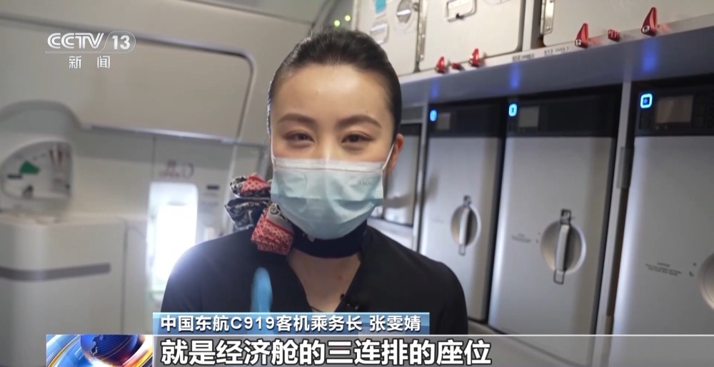中國東航C919客機(jī)乘務(wù)長 張雯婧:我們非常特別的一點(diǎn)就是經(jīng)濟(jì)艙的三連排的座位,它要比其他的飛機(jī)中間座位更寬一點(diǎn),寬1.5厘米。