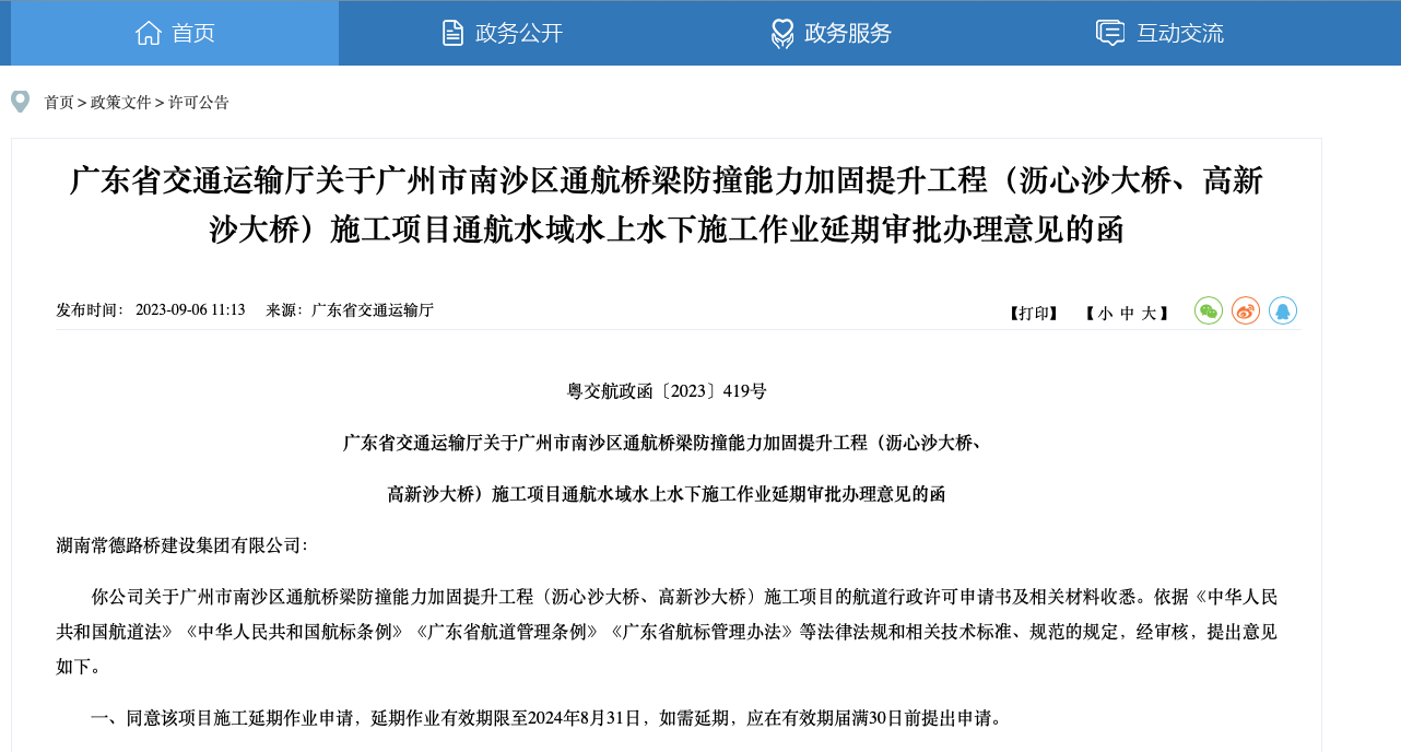 2023年9月,廣東省交通運輸廳又發(fā)布瀝心沙大橋、高新沙大橋防撞加固工程延期審批意見,文件中稱“同意該項目施工延期作業(yè)申請,延期作業(yè)有效期限至2024年8月31日”。