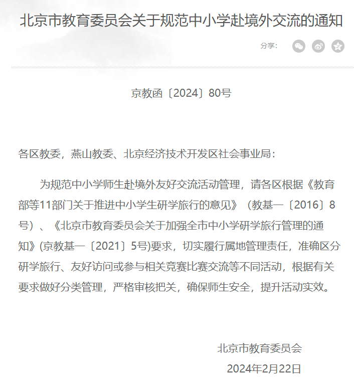 央廣網(wǎng)北京3月11日消息(記者馮儀)近日,北京市教委發(fā)布關(guān)于規(guī)范中小學(xué)赴境外交流的通知,通知中提到,請各區(qū)根據(jù)《教育部等11部門關(guān)于推進(jìn)中小學(xué)生研學(xué)旅行的意見》(教基一〔2016〕8號)、《北京市教育委員會關(guān)于加強(qiáng)全市中小學(xué)研學(xué)旅行管理的通知》(京教基一〔2021〕5號)要求,切實(shí)履行屬地管理責(zé)任,準(zhǔn)確區(qū)分研學(xué)旅行、友好訪問或參與相關(guān)競賽比賽交流等不同活動,根據(jù)有關(guān)要求做好分類管理,嚴(yán)格審核把關(guān),確保師生安全,提升活動實(shí)效。