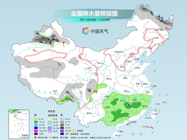 后天,內(nèi)蒙古中部、黑龍江東北部、新疆沿天山地區(qū)和南疆盆地北部、西藏東南部、青海北部和東部、甘肅中部和西南部等地部分地區(qū)有小雪或雨夾雪,其中,新疆沿天山地區(qū)、西藏東南部、青海北部等地部分地區(qū)有中雪,局地大雪(5~9毫米)。陜西中部、河南中西部、江淮大部、江漢、江南大部、四川盆地西南部、重慶東北部、貴州中東部、華南北部等地部分地區(qū)有小到中雨,其中,湖南東北部、江西北部等地部分地區(qū)有大雨(25~45毫米)。