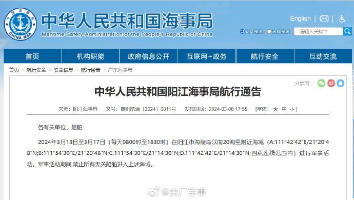 陽江海事局發(fā)布航行警告,3月13日至3月17日,每天8時(shí)至18時(shí)30分,在陽江市海陵島以南20海里附近海域進(jìn)行軍事活動(dòng),禁止駛?cè)搿?/p>