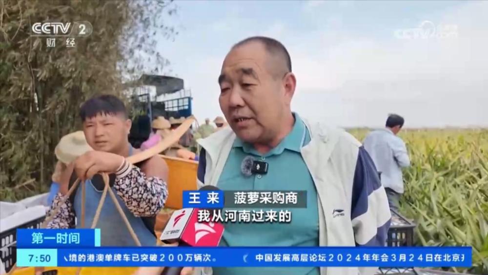 菠蘿采購(gòu)商 王來(lái):我從河南過(guò)來(lái)的。這個(gè)季節(jié)每天發(fā)個(gè)幾十車是沒(méi)什么問(wèn)題的,也就是幾十萬(wàn)斤,基本上每天都發(fā)。