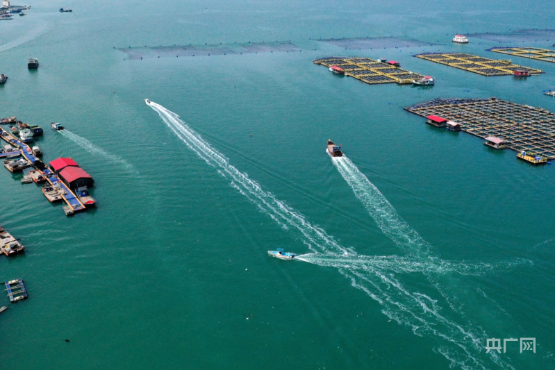養(yǎng)殖工人駕駛漁船在養(yǎng)殖區(qū)穿梭(央廣網(wǎng)發(fā) 王旺旺 攝)