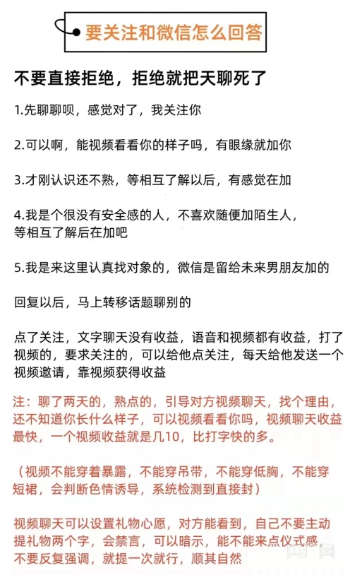 記者注意到,“使用手冊”第一頁聲明中稱,只參與軟件推廣,不涉及套路教學、虛假聊天、誘導充值。當記者對是否能賺到錢表示擔憂時,該推廣員發(fā)來一份“社交聊天日入千元攻略”,包含怎樣設置頭像、如何引導對方視頻聊天、如何拒加微信等信息。