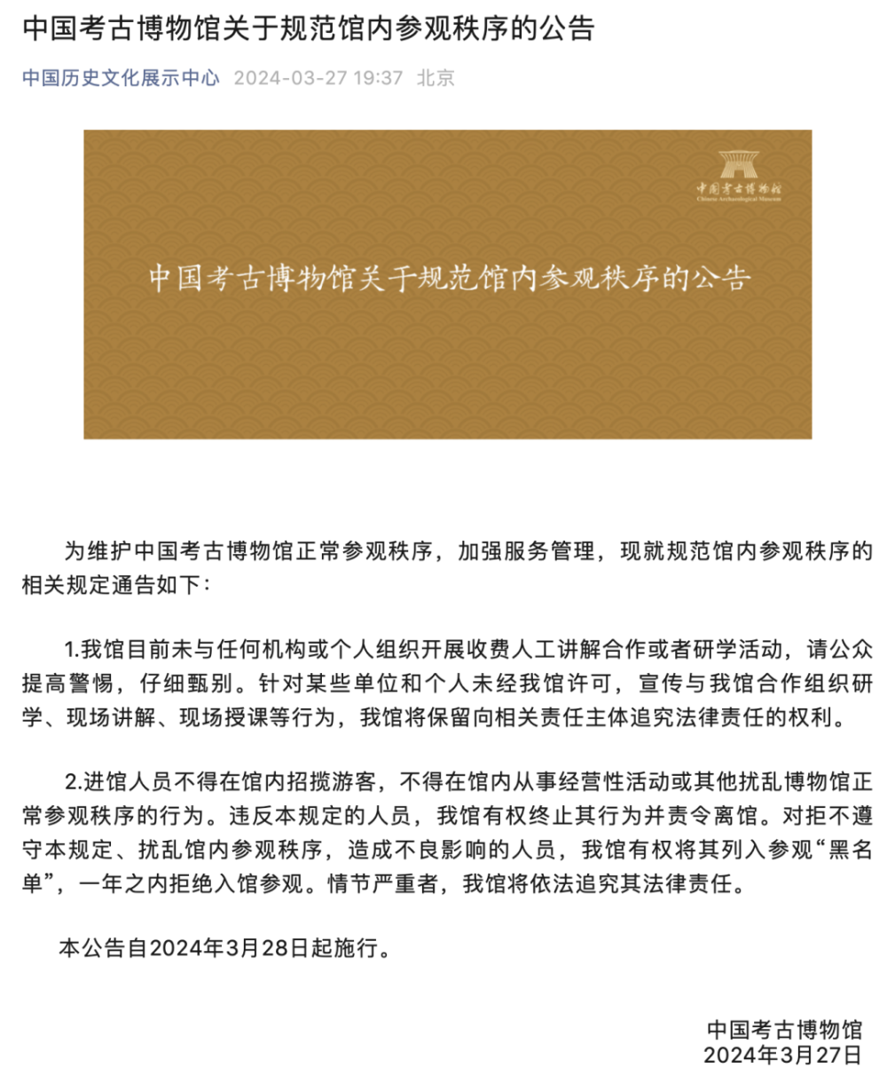 3月27日,中國考古博物館發(fā)布關于規(guī)范館內參觀秩序的公告。