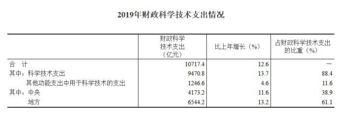 2019年,國(guó)家財(cái)政科學(xué)技術(shù)支出10717.4億元,比上年增加1199.2億元,增長(zhǎng)12.6%。其中,中央財(cái)政科學(xué)技術(shù)支出4173.2億元,增長(zhǎng)11.6%,占財(cái)政科學(xué)技術(shù)支出的比重為38.9%;地方財(cái)政科學(xué)技術(shù)支出6544.2億元,增長(zhǎng)13.2%,占比為61.1%。