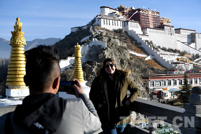新年第一天,記者在西藏自治區(qū)拉薩市藥王山觀景臺遇見了來自美國的游客Lauren和她的團友們。這是一個由8名游客組成的外賓團,他們分別來自美國、哥倫比亞等7個國家。