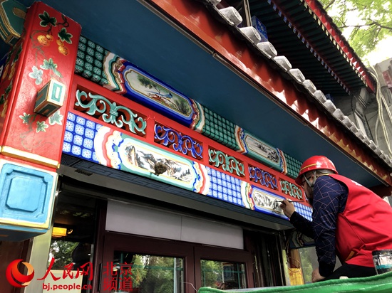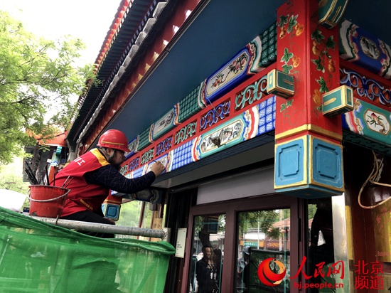 人民網(wǎng)北京5月14日電(池夢(mèng)蕊)初夏時(shí)節(jié),北京南池子大街、北池子大街和東華門大街上綠樹成蔭。建設(shè)者們?cè)诮值纼蓚?cè)的小型圍擋內(nèi)忙碌著,對(duì)著一處處木門、門頭、外墻、屋檐和門廊彩繪如切如磋、如琢如磨。
