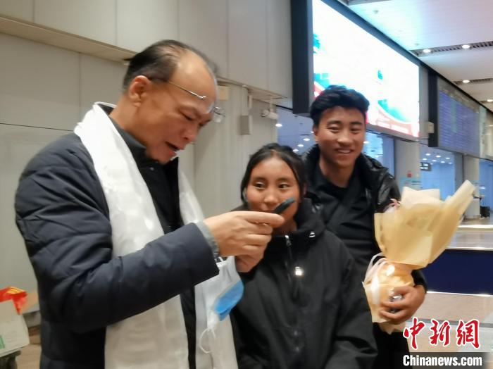 11月14日下午,來自西藏自治區(qū)昌都市的8名脊柱側(cè)彎患者到達北京首都國際機場。圖為北京大學第一醫(yī)院骨科主任李淳德(左)和藏族女孩澤巴央宗、哥哥貢布鄧珠交談。 徐雪瑩 攝