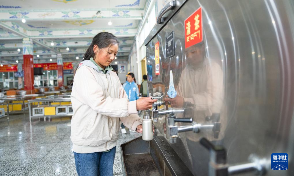 班戈縣中石化小學學生旺青拉姆用水杯接清茶(6月22日攝)。