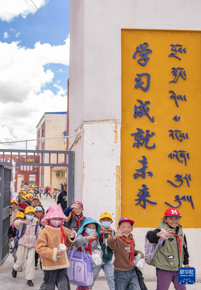 班戈縣中石化小學學生放學后走出校門(6月22日攝)。