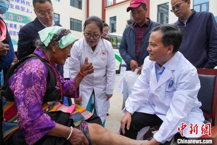 圖為青島醫(yī)療專家團(tuán)隊(duì)在日喀則為62歲的倉(cāng)木拉老人進(jìn)行診斷,倉(cāng)木拉對(duì)援藏醫(yī)療專家豎起大拇指。王建亮 攝