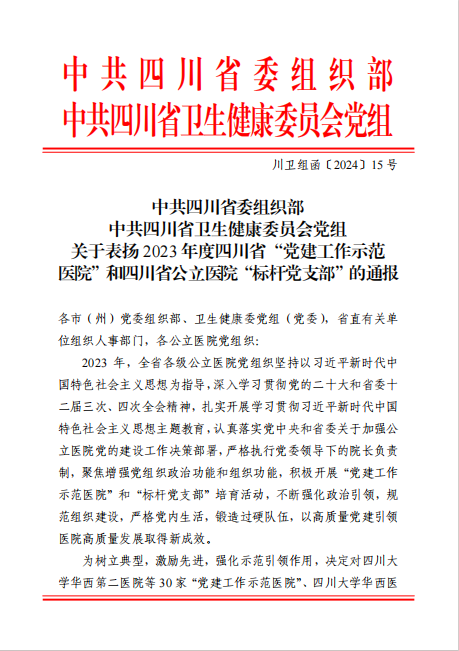 近日,中共四川省委組織部、中共四川省衛(wèi)生健康委員會黨組發(fā)文通報(bào)表揚(yáng)了2023年度四川省“黨建工作示范醫(yī)院”和公立醫(yī)院“標(biāo)桿黨支部”(川衛(wèi)組函〔2024〕15號),安岳縣人民醫(yī)院榮獲2023年度四川省“黨建工作示范醫(yī)院”!