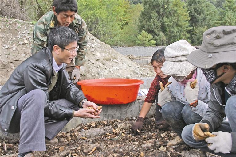 廣東省第七批援藏工作隊成員肖國鑫(左一)在波密縣指導(dǎo)當(dāng)?shù)剞r(nóng)牧民種植天麻。