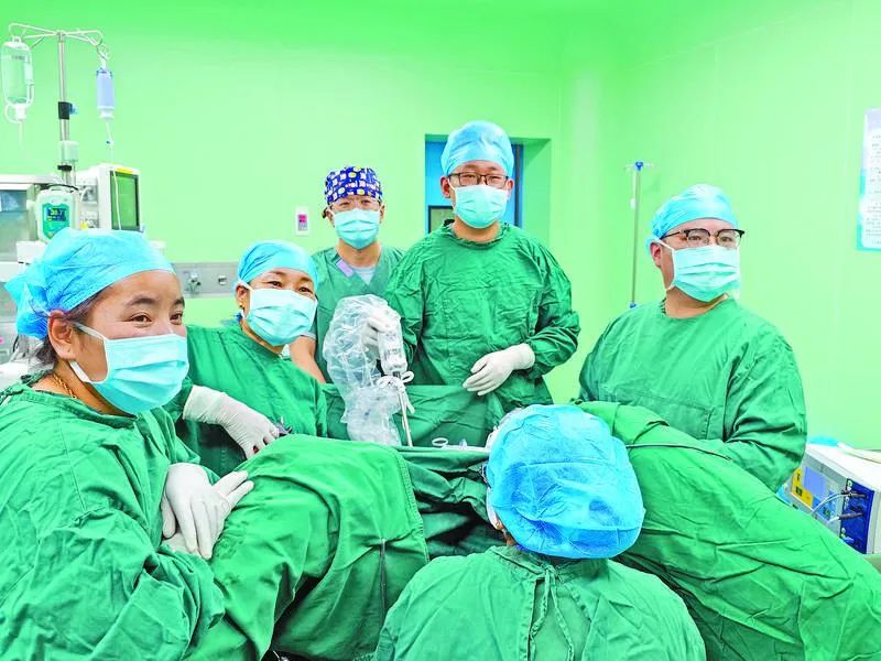 上海援藏醫(yī)療專家隋孟松(右一)帶領(lǐng)本地婦科醫(yī)生開展日喀則市首例腹腔鏡下全子宮切除手術(shù)。