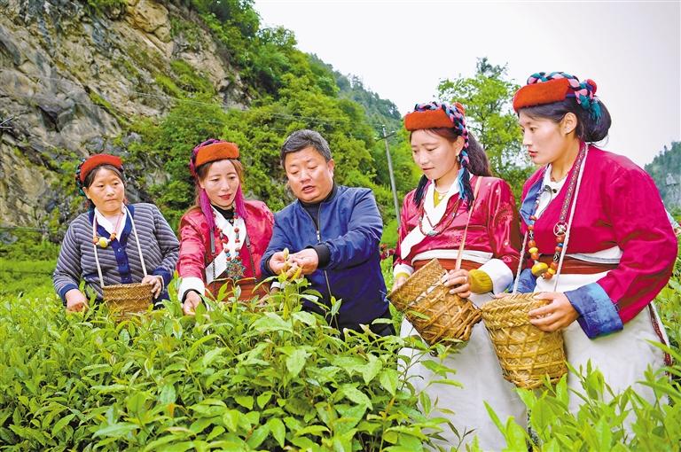 錯那市勒布溝,安徽第七批援藏隊隊員裴含龍指導(dǎo)門巴族村民規(guī)范采摘茶葉。