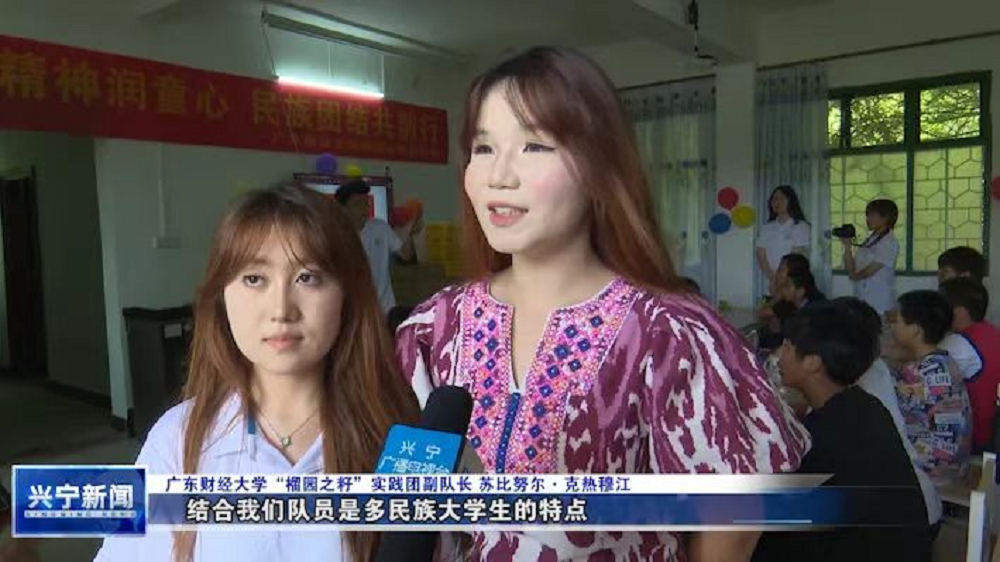 實(shí)踐團(tuán)隊員蘇比努爾 克熱穆江介紹到:在廣財大,校內(nèi)石榴樹生機(jī)勃勃,校園有“榴園”的雅稱。我們的隊員是來自廣財?shù)母髅褡宕髮W(xué)生,是“榴園”內(nèi)的“石榴籽”,因此老師為我們?nèi)∶傲駡@之籽”實(shí)踐團(tuán)。
