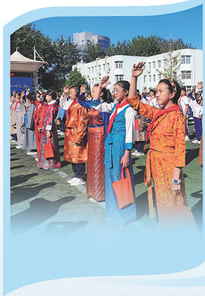 拉薩北京實驗中學學生在北京市順義區(qū)第五中學參加升旗儀式。馬瀟雅攝