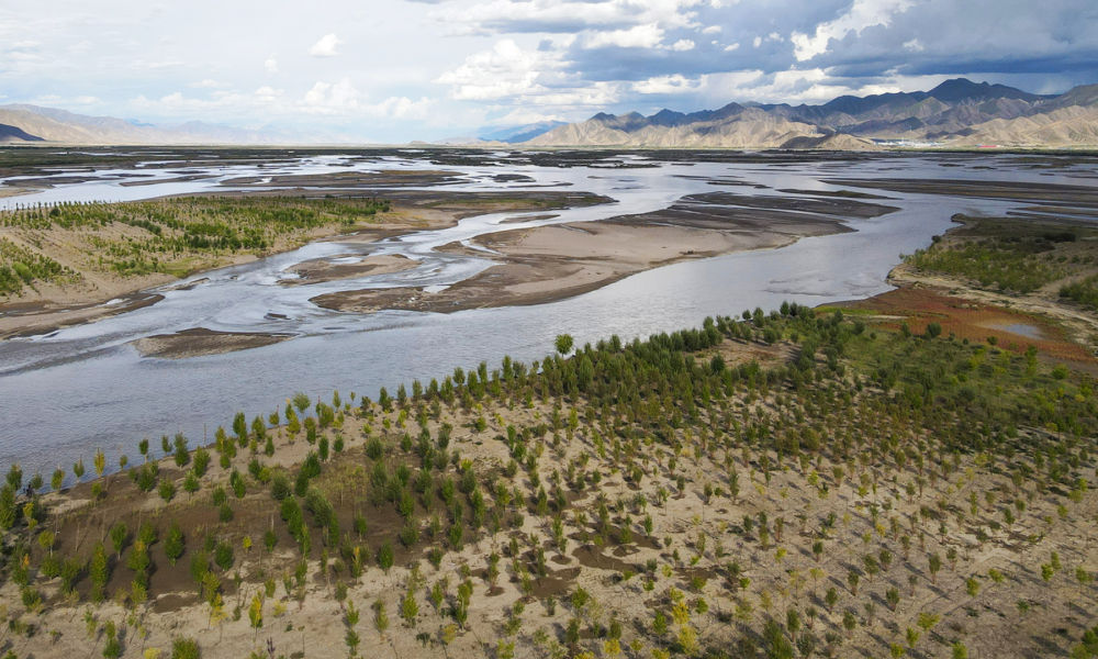 雅魯藏布江沿線日喀則市境內(nèi)河岸兩旁綠意盎然(2020年9月4日攝,無(wú)人機(jī)照片)。 新華社發(fā)(索朗羅布 攝)