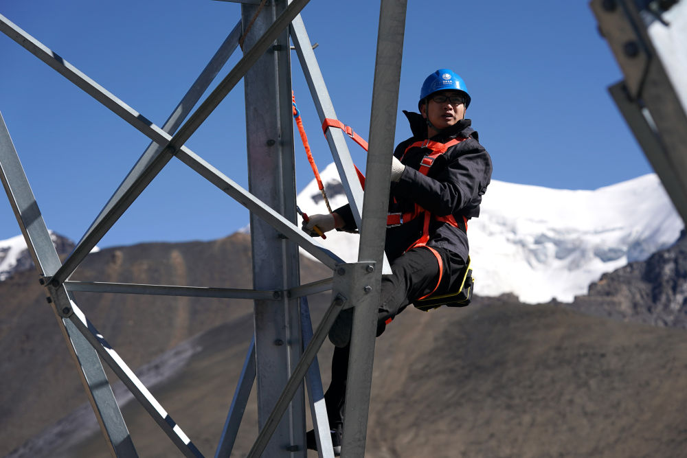 在西藏山南市洛扎縣,國(guó)家電網(wǎng)安徽省電力有限公司援藏工作人員徐四勤在浪洛線197號(hào)鐵塔進(jìn)行線路巡視(2020年11月4日攝)。新華社記者 詹彥 攝