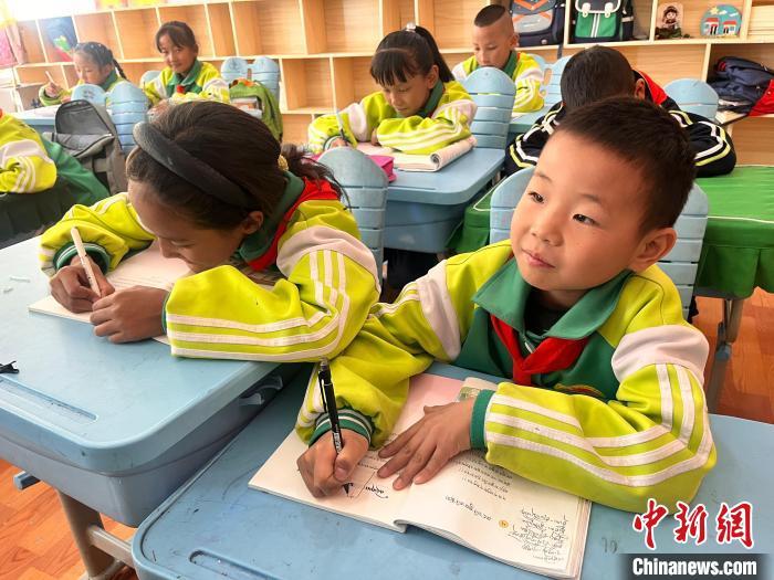 與此同時(shí),四年級(jí)2班的漢族學(xué)生劉念恩正在上藏語(yǔ)文課,他抄寫有些慢,同桌的女生立刻用筆幫他找到對(duì)照位置?!拔覀儼嘀挥形乙粋€(gè)漢族,我也要上藏語(yǔ)文課,同學(xué)們和我關(guān)系非常好,我們經(jīng)常一起踢足球?!眲⒛疃髡f。