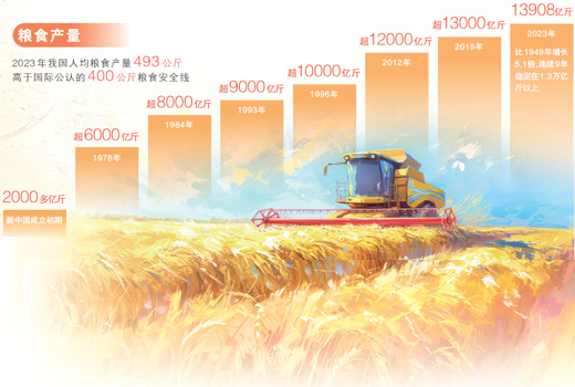 豐收成色十足?!安丶Z于地、藏糧于技”戰(zhàn)略深入實施,我國糧食綜合生產(chǎn)能力穩(wěn)步提升,連續(xù)9年穩(wěn)定在1.3萬億斤以上。截至2023年,全國綠色、有機、名特優(yōu)新和地理標志農(nóng)產(chǎn)品認證登記總數(shù)達到7.5萬個。蔬菜水果品種琳瑯滿目,居民的“菜籃子”“果盤子”更加豐富。