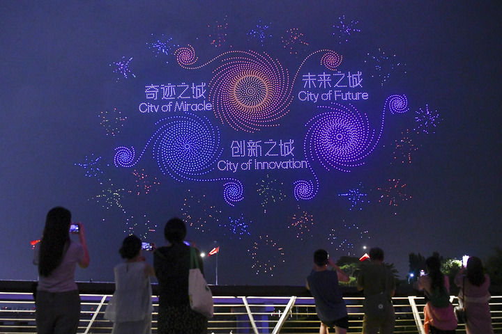 2024年9月26日,市民、游客在深圳灣觀看廣東深圳大漠大智控技術有限公司呈現(xiàn)的無人機編隊表演。新華社記者 梁旭 攝
