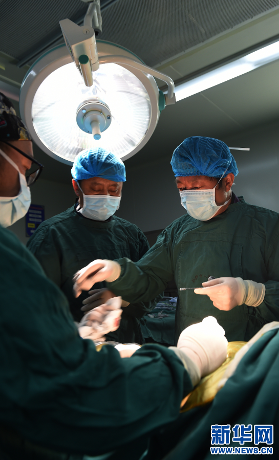 2017年5月26日,援藏醫(yī)生李家謀(右一)帶領拉薩市人民醫(yī)院的藏族醫(yī)生進行脊柱微創(chuàng)手術。新華社記者 覺果 攝