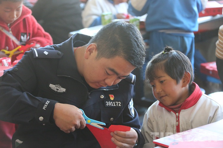 圖為拉薩邊檢站民警和孩子們共同完成手工剪紙 攝影:王佳豪