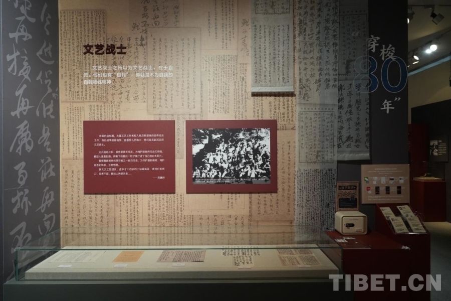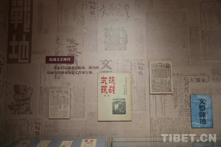 圖為中國現(xiàn)代文學館內(nèi),“山河跡憶——手稿里的抗戰(zhàn)中國”展覽中“文藝戰(zhàn)士”展示墻 攝影:郭睿佳