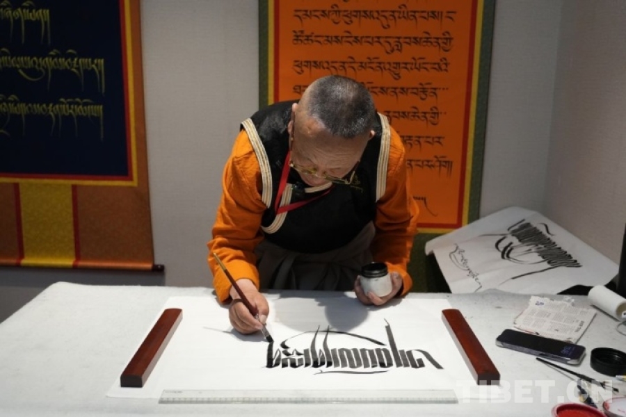 圖為第二屆“文化原鄉(xiāng) 福地壤塘”2025北京行活動期間,參展者為觀眾展示藏文書法技藝 攝影:王茜