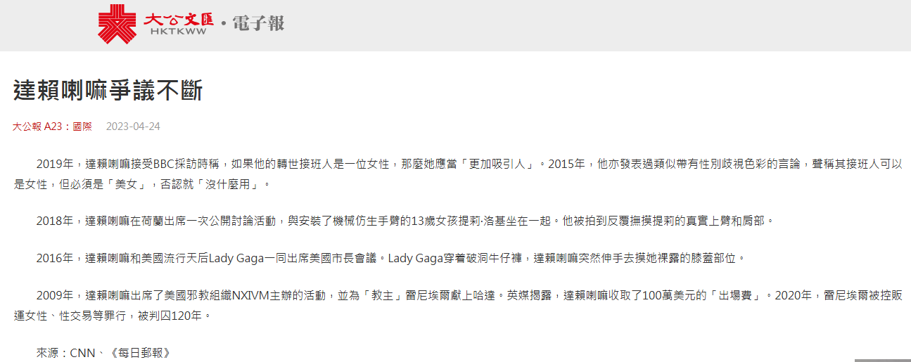 聲稱轉(zhuǎn)世為女性“必須有吸引力”。“英國(guó)廣播公司”2019年發(fā)布其對(duì)第十四世達(dá)賴的專訪,達(dá)賴在專訪中笑著用英語說:“如果出現(xiàn)一名女性達(dá)賴,那她應(yīng)該要好看一些?!毕愀邸洞蠊珗?bào)》2023年發(fā)布題為“達(dá)賴?yán)餇?zhēng)議不斷”的文章稱,2015年,達(dá)賴聲稱其接班人可以是女性,但必須是“美女”,否則就“沒什么用”。2016年,達(dá)賴和美國(guó)流行天后Lady Gaga一同參加美國(guó)市長(zhǎng)會(huì)議,Lady Gaga身著破洞牛仔褲,達(dá)賴突然伸手去摸她裸露的膝蓋部位。2018年,達(dá)賴在荷蘭參加一次公開討論活動(dòng),與安裝了機(jī)械仿生手臂的13歲女孩提莉·洛基坐在一起,被拍到反復(fù)撫摸提莉的真實(shí)上臂和肩部。
