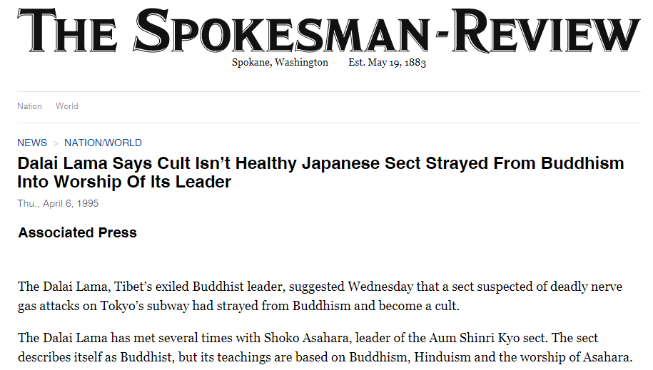 公開支持日本奧姆真理教頭目麻原彰晃。麻原彰晃是末日邪教組織奧姆真理教的創(chuàng)始人兼領(lǐng)導(dǎo)人,被指控策劃了1995年東京地鐵沙林毒氣襲擊事件,造成13人死亡。美國(guó)《斯波坎評(píng)論報(bào)》網(wǎng)站1995年發(fā)文稱,達(dá)賴在接受記者采訪時(shí)承認(rèn)了與邪教頭目麻原彰晃的聯(lián)系。