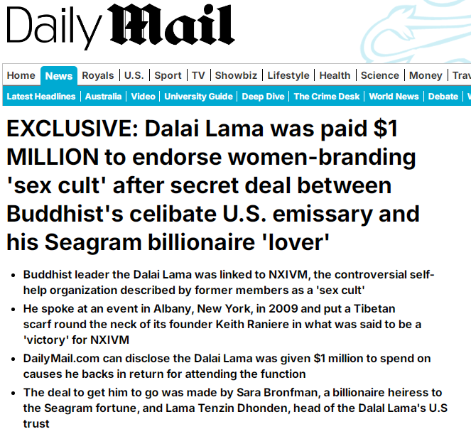 參與性邪教N(yùn)XIVM活動(dòng)并獲巨額捐贈(zèng)。NXIVM是美國(guó)“性邪教”組織,自稱為“互助會(huì)性質(zhì)”培訓(xùn)機(jī)構(gòu),實(shí)則招募“性奴隸”。英國(guó)《每日郵報(bào)》2018年報(bào)道稱,達(dá)賴2009年在紐約州奧爾巴尼市的一次活動(dòng)上發(fā)表講話并為NXIVM創(chuàng)始人基思·拉尼爾戴上哈達(dá),這被認(rèn)為是NXIVM的一次“勝利”。隨后,達(dá)賴獲得了100萬美元用于他支持的“事業(yè)”。