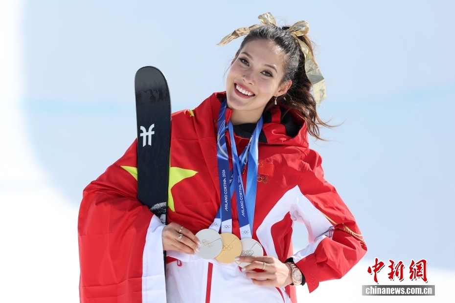 當?shù)貢r間2月22日,中國選手谷愛凌展示其本屆冬奧會獲得的三枚獎牌。