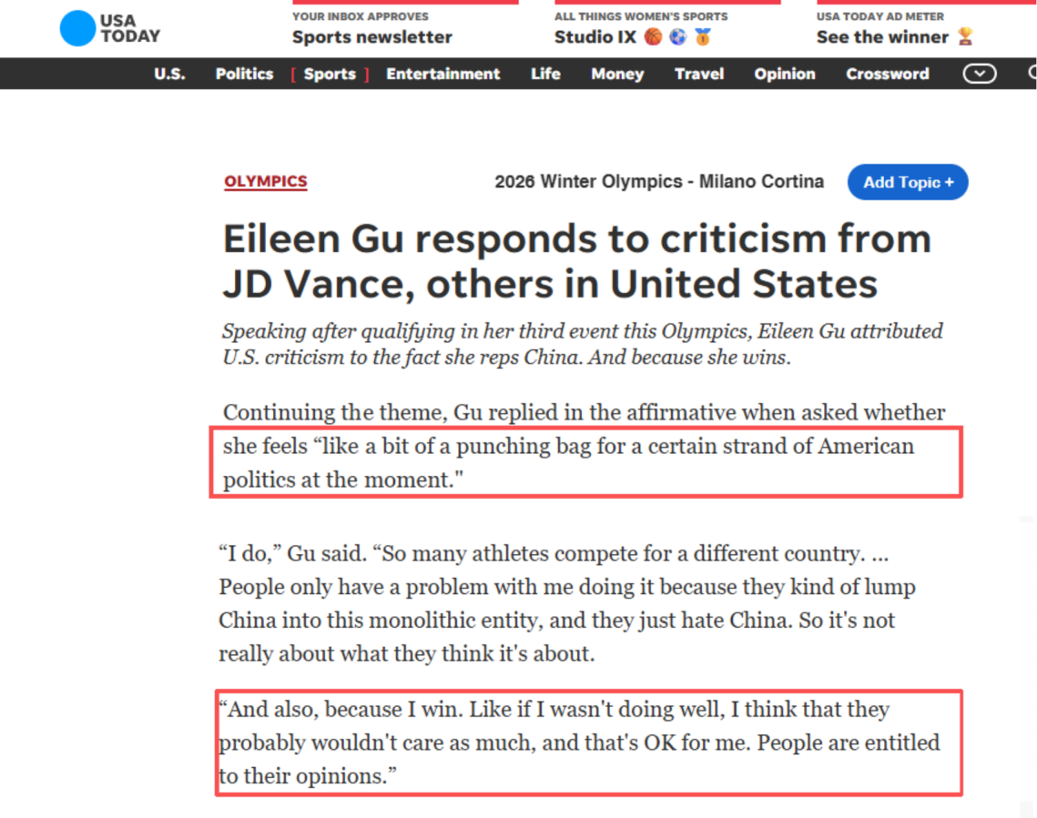 2026年2月19日,谷愛凌在接受《今日美國》時坦言自己像是某種美國政治勢力下的“靶子”。
