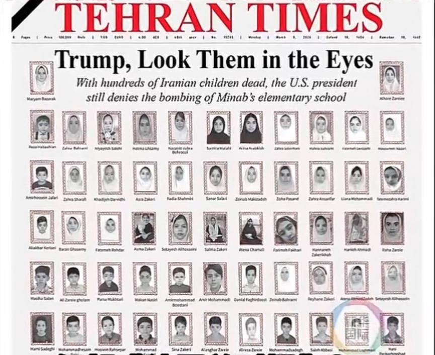 伊朗《德黑蘭時報》3月9日在頭版刊發(fā)題為《特朗普,請注視他們的眼睛》的文章,此前美國空襲導致伊朗南部米納卜市一所小學至少165人遇難、96人受傷 圖片來源:新華社