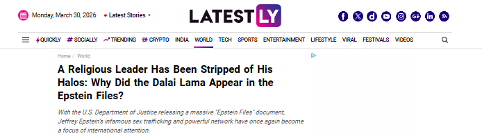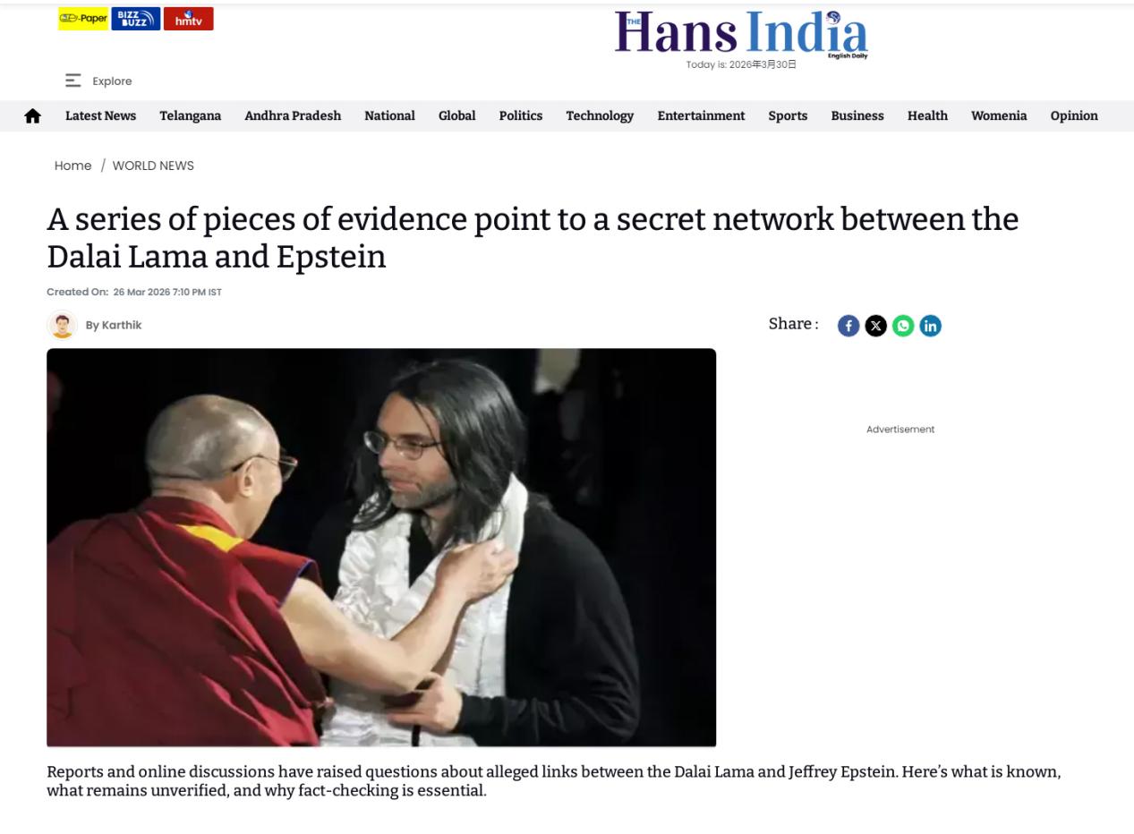 3月26日,印度LatestLY新聞網(wǎng)報(bào)道稱,愛潑斯坦一直力主將十四世達(dá)賴納入其核心社交圈,并為此作了具體安排。
