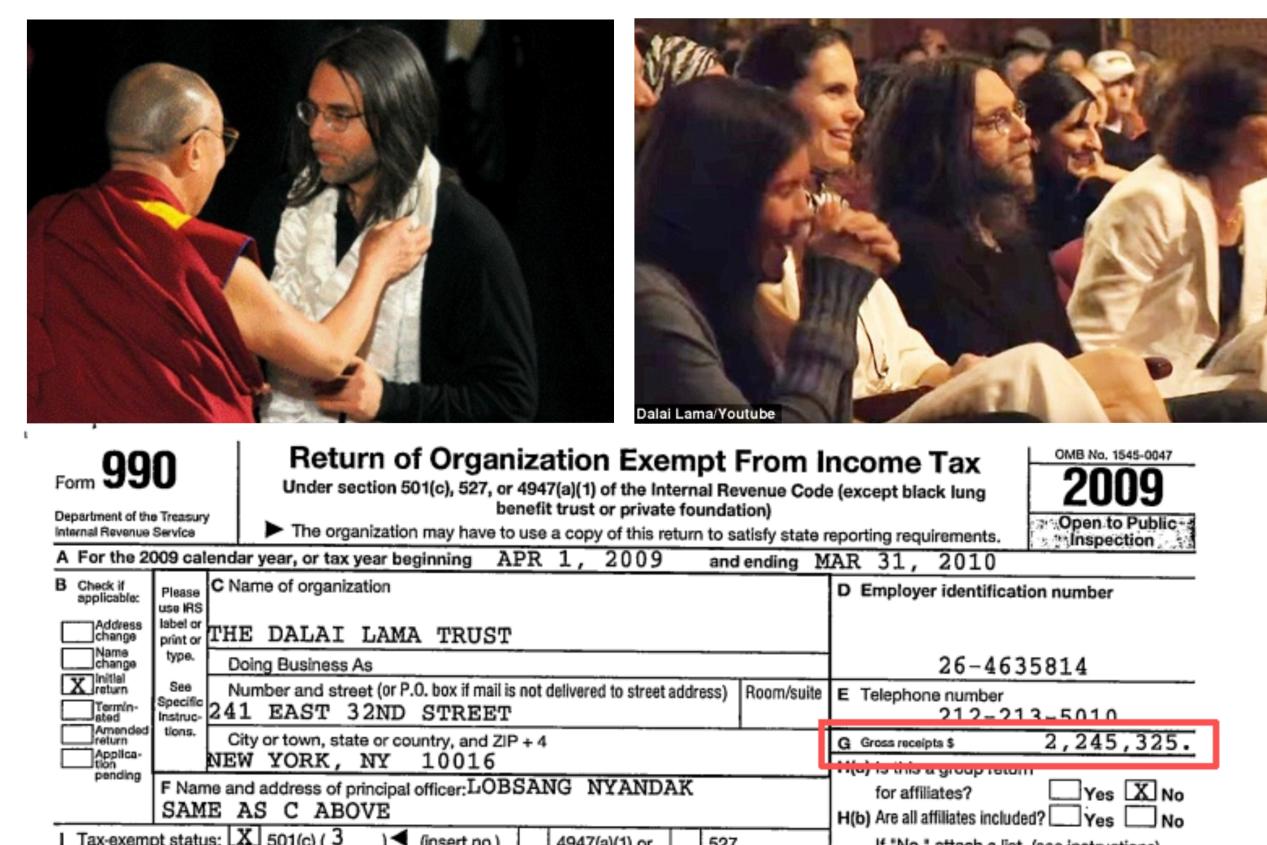 上圖左:達(dá)賴為性邪教組織NXIVM頭目基思·拉尼爾戴哈達(dá) 上圖右:基思·拉尼爾與金主布朗夫曼姐妹聆聽達(dá)賴的演講 下圖:美國國稅局的報(bào)稅表顯示,2009年“達(dá)賴信托基金會(huì)”入賬220余萬美元