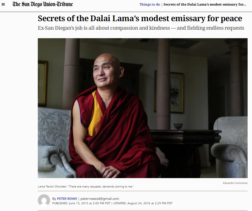 2015年丹增東登接受美國《圣地亞哥聯(lián)合論壇報(bào)》采訪。該媒體當(dāng)時(shí)稱其為“達(dá)賴?yán)镏t遜的和平使者”,現(xiàn)在讀來頗感諷刺。