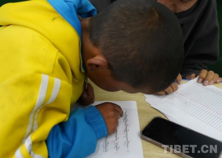 2025年9月1日,拉薩市第一小學(xué)一年級學(xué)生展示在藏語文課上學(xué)會(huì)的藏文。攝影:李林