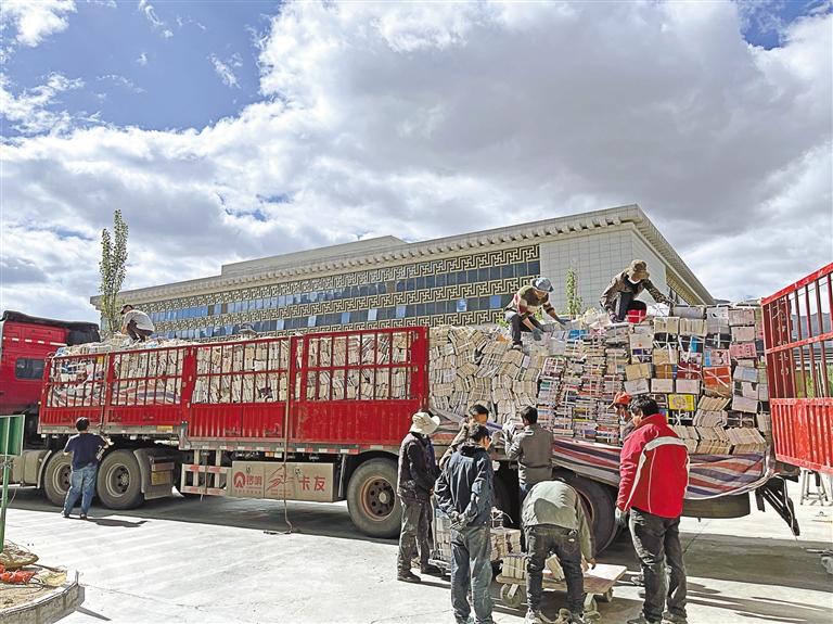 圖為工作人員在搬運圖書。記者 格桑倫珠 攝
