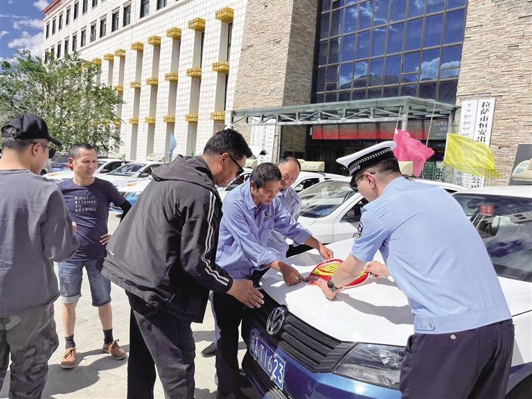 拉薩市恒安出租車有限公司工作人員正在張貼送考標(biāo)志。