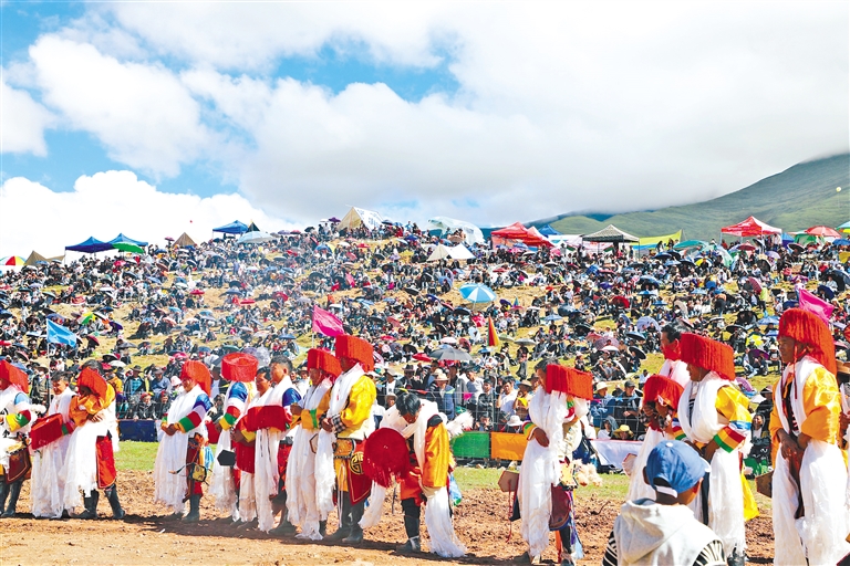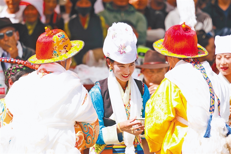 在邊交林鄉(xiāng)當(dāng)杰村“望果節(jié)”活動現(xiàn)場,隨著激昂的《運動員進行曲》,當(dāng)杰村“平措林望果節(jié)”活動拉開帷幕,38名馬術(shù)運動員、38名射箭運動員在2萬多名觀眾的歡呼聲中邁入現(xiàn)場。