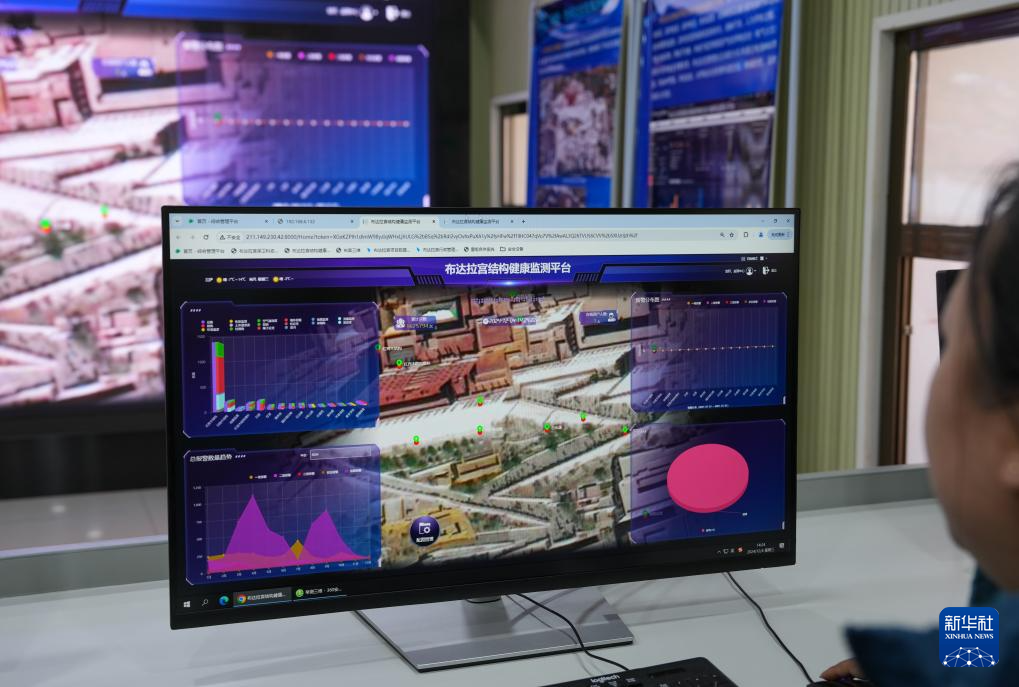 12月4日,布達(dá)拉宮監(jiān)測中心的工作人員在查看布達(dá)拉宮結(jié)構(gòu)健康監(jiān)測平臺(tái)。新華社記者 晉美多吉 攝