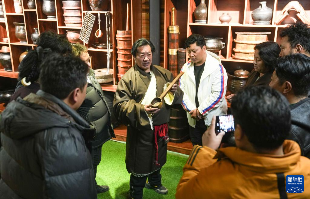 當(dāng)?shù)孛袼讓?zhuān)家貢布洛旺(中左)在“牧人寶庫(kù)”藏式茶館給顧客講解館藏物件(2月13日攝)。新華社記者 晉美多吉 攝